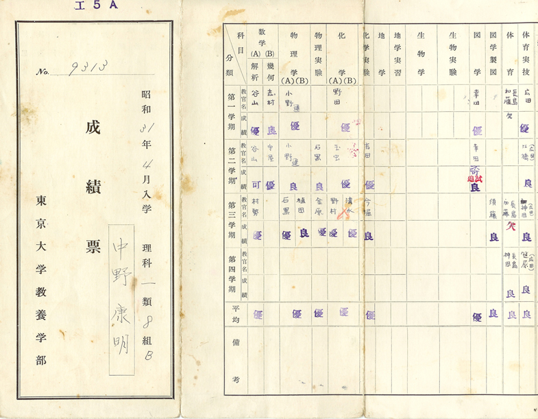 成績票の表に押されている「工5A」は、工学部進級生のクラス名だが、 「A」は第二外国語のクラス (ドイツ語) だったかも知れない。