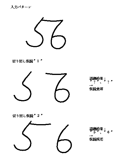 この方法では、切り出し部で複数の仮説を立てる。 認識部では、その仮説に従った文字パターンを認識するが、妙なところで切り出すと、 認識結果はリジェクトとなる筈である(そのためには、認識部の性能が高い必要がある)。 認識部でリジェクトされない切り出し仮説を採用することにより、 切り出しと認識が同時に得られる。例を示す。